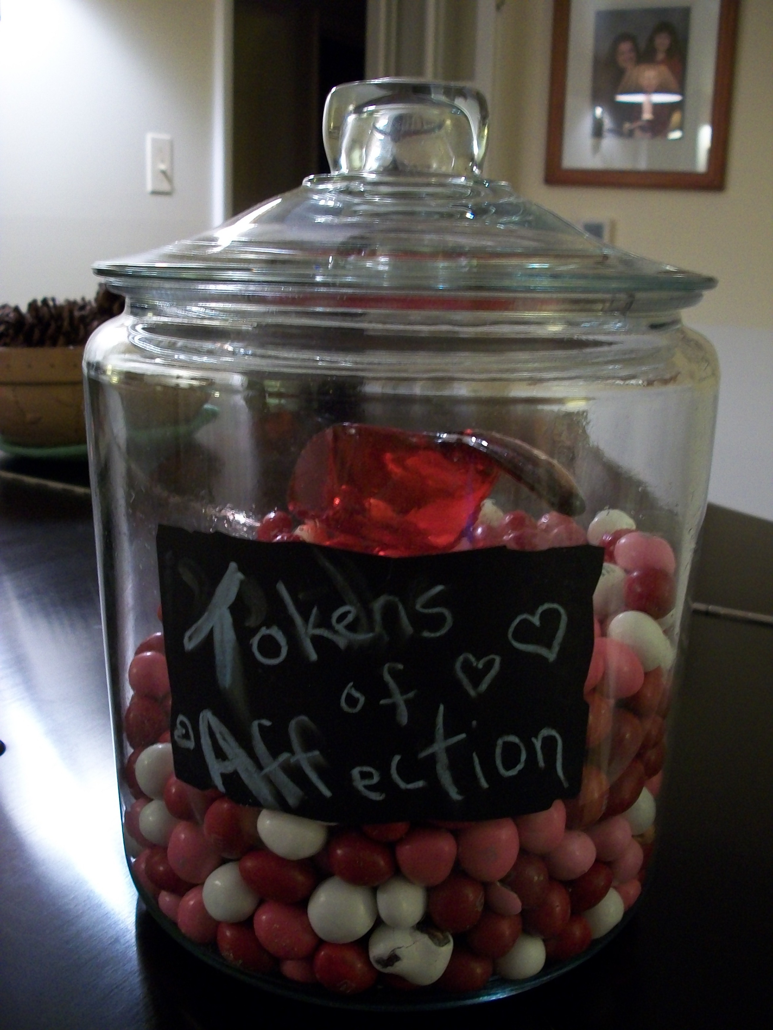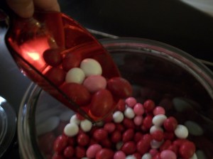 I even try to switch it up a little, to further this experiment. I color coordinate for the holidays. But they still don’t get eaten, so I find I have Christmas Colored M&M’s still here in January. I actually went ahead and took the green ones out to save for St. Patrick’s Day. (Troy thinks that was time well spent on my part…not.) Oh, and I’ve changed the label to from “Attitude Adjustments” to ‘Tokens of Affection’ for Valentine’s Day. Very Martha Stewart of me, I know.