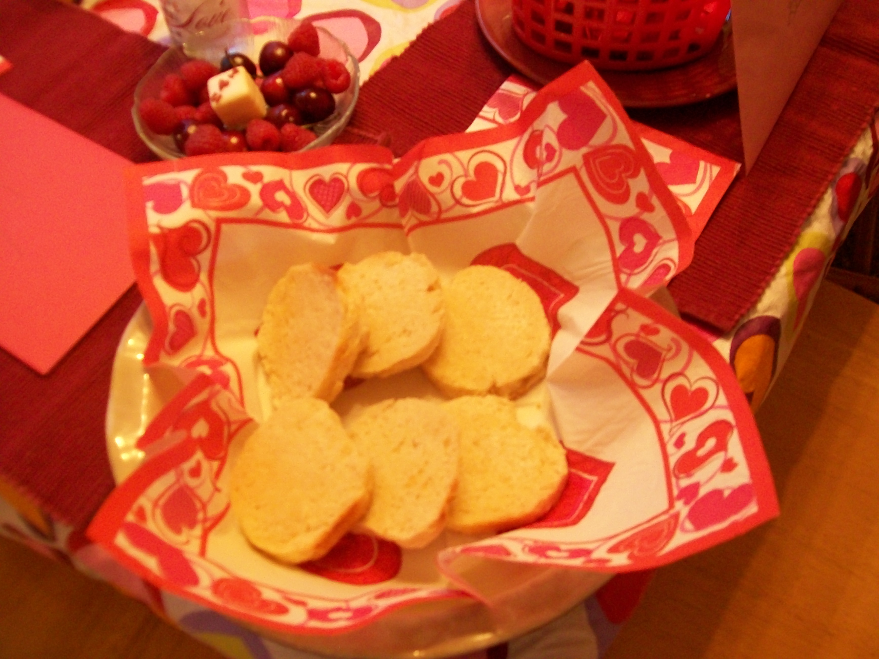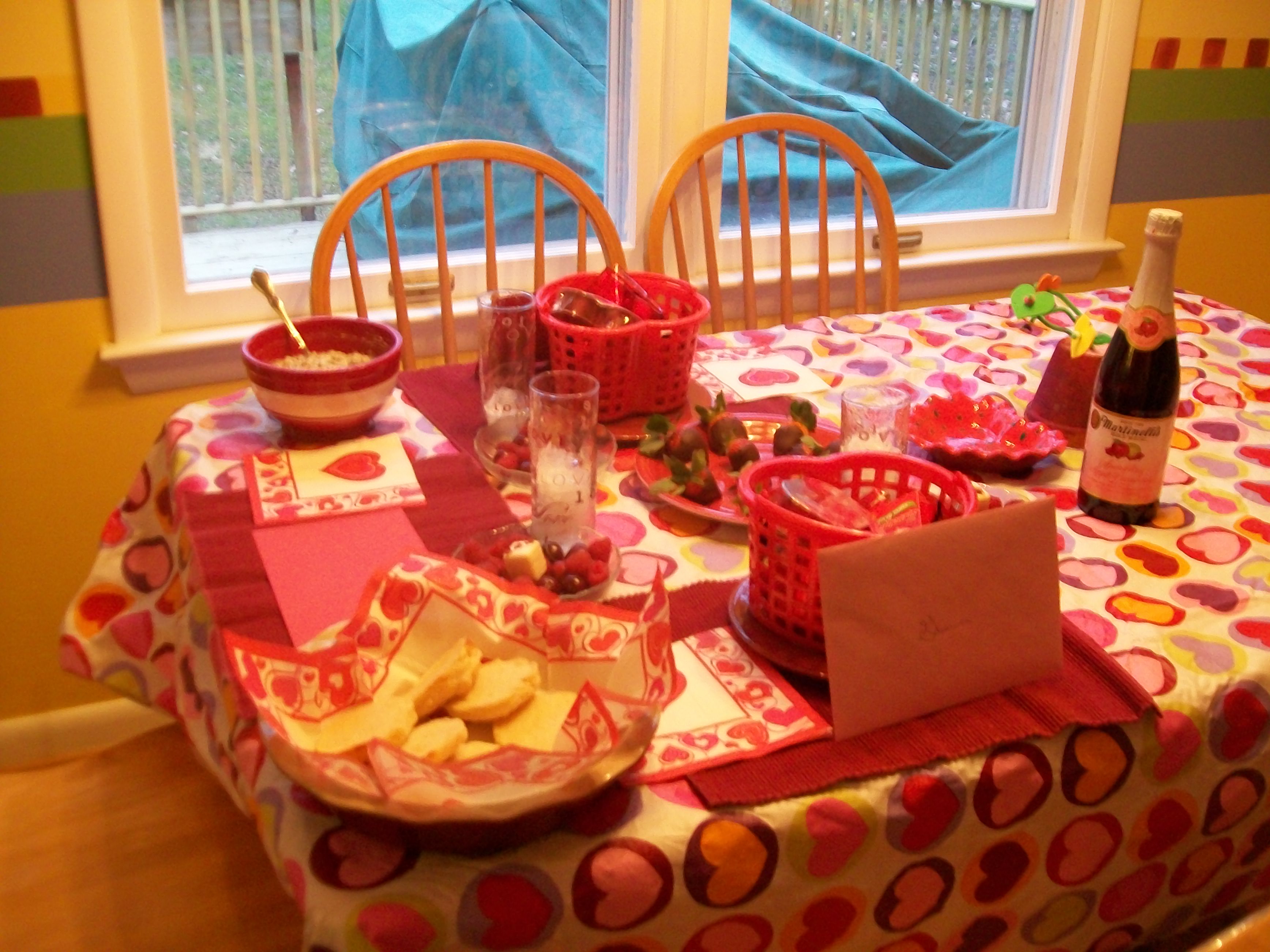 I decorated the kid’s placemats with baskets of Valentines goodies ranging from I LOVE YOU cards to chocolate heart boxes.  Troy’s place had a sweet mushy loving card and some freshly brewed coffee just the way he likes it….blacker than black. We had sparkling apple/cranberry juice served in a wine bottle. And, as tradition, I put the old valentine’s crafts the kids made when they were 3 years old on the table as centerpieces.  All of these things were lovingly set on the old valentine’s tablecloth I’ve used for 10 years.  You know the one we all have with obnoxious, multicolored hearts all over it.  Fabulous!