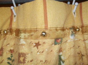 This season’s curtain is a gold / tan / brown flannel with green accents. It’s got a “let it snow” theme with snowmen. I even put jingle bells at the top.