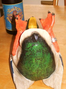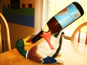 He holds bottled beverages of your choice. Wine. Beer. Ketchup. Whatever you might like him to hold for you. He’s a very helpful sort of duck. But there is one little quirk about him.