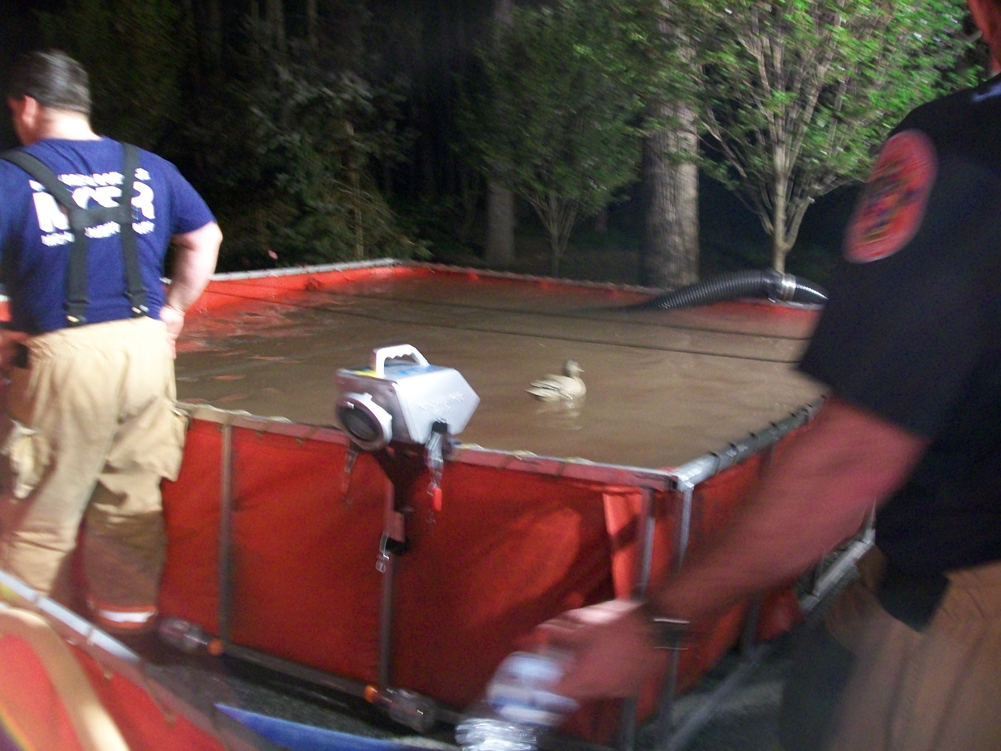 In order to do this, they have to set up some Folding Tanks (which look like oversized kiddie pools). The tankers dump water into the Folding Tanks, and then the engine pumps it up to the fire. And this has to happen: 1) Very Very Quickly, 2) without anyone getting hurt, and 3) effectively! A firefighter without water is, if not helpless, then at the very least, not happy!