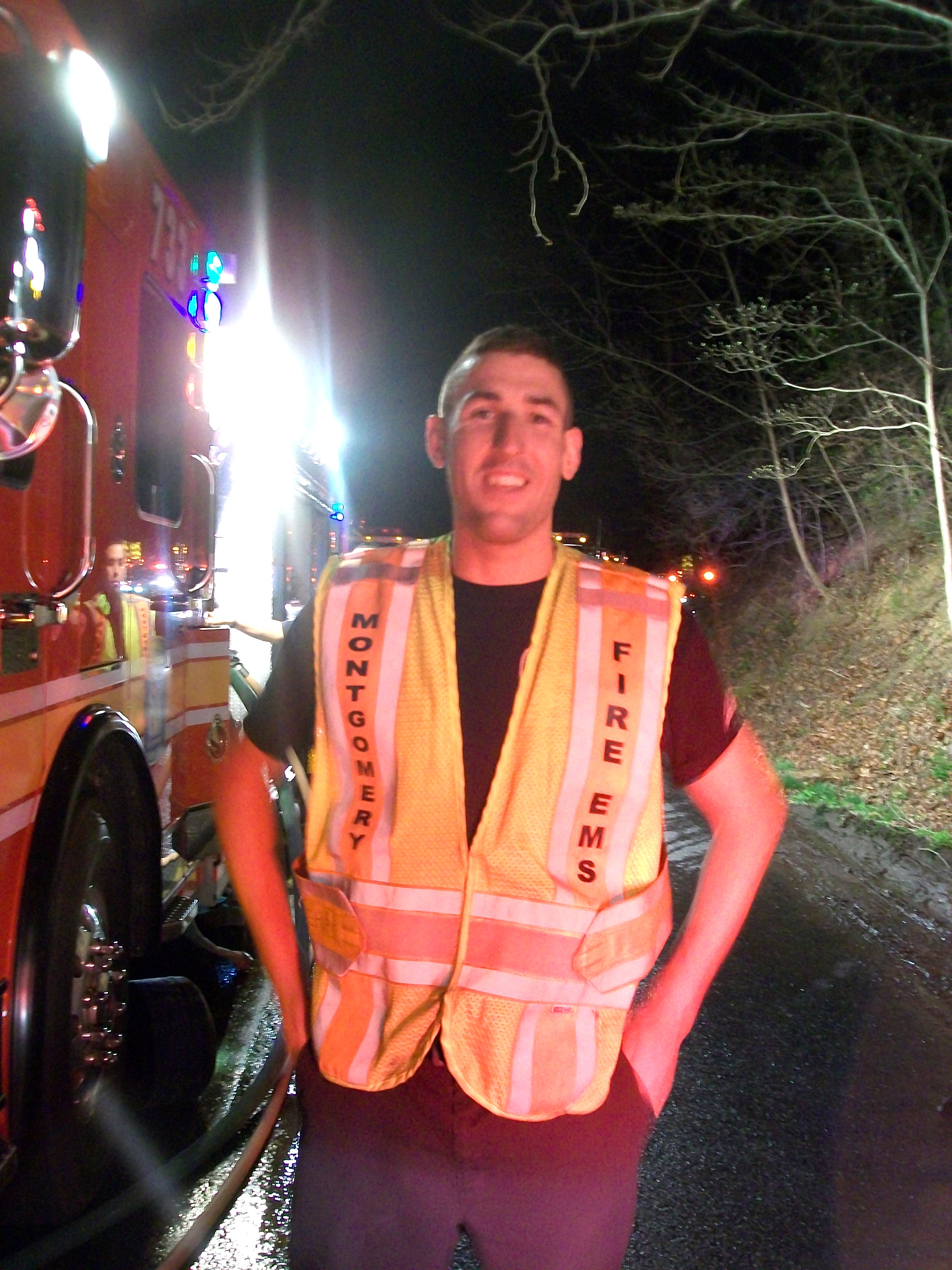 Check with his guys to see that they are doing ok (Here’s Brett. We love Brett. He is the guy who had been manning the nozzle of the hose My Captain had been sitting on.)
