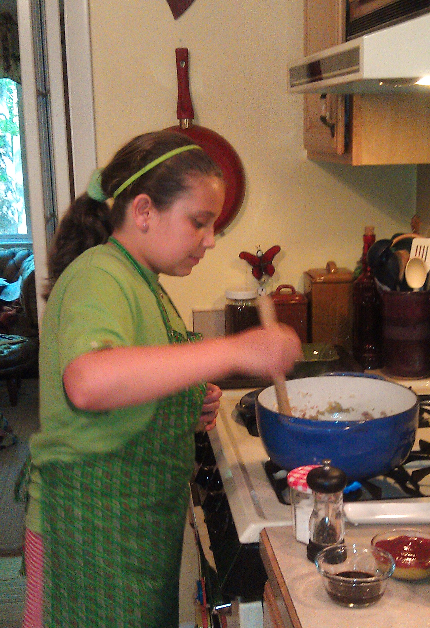 She’d chopped up the onions, celery, garlic, added the beef, mustard, ketchup, brown sugar, Worcherchestershiresheriiresre (I’m not entirely sure on that spelling.), and then threw in pinches of kosher salt like ANY Food Network star would.