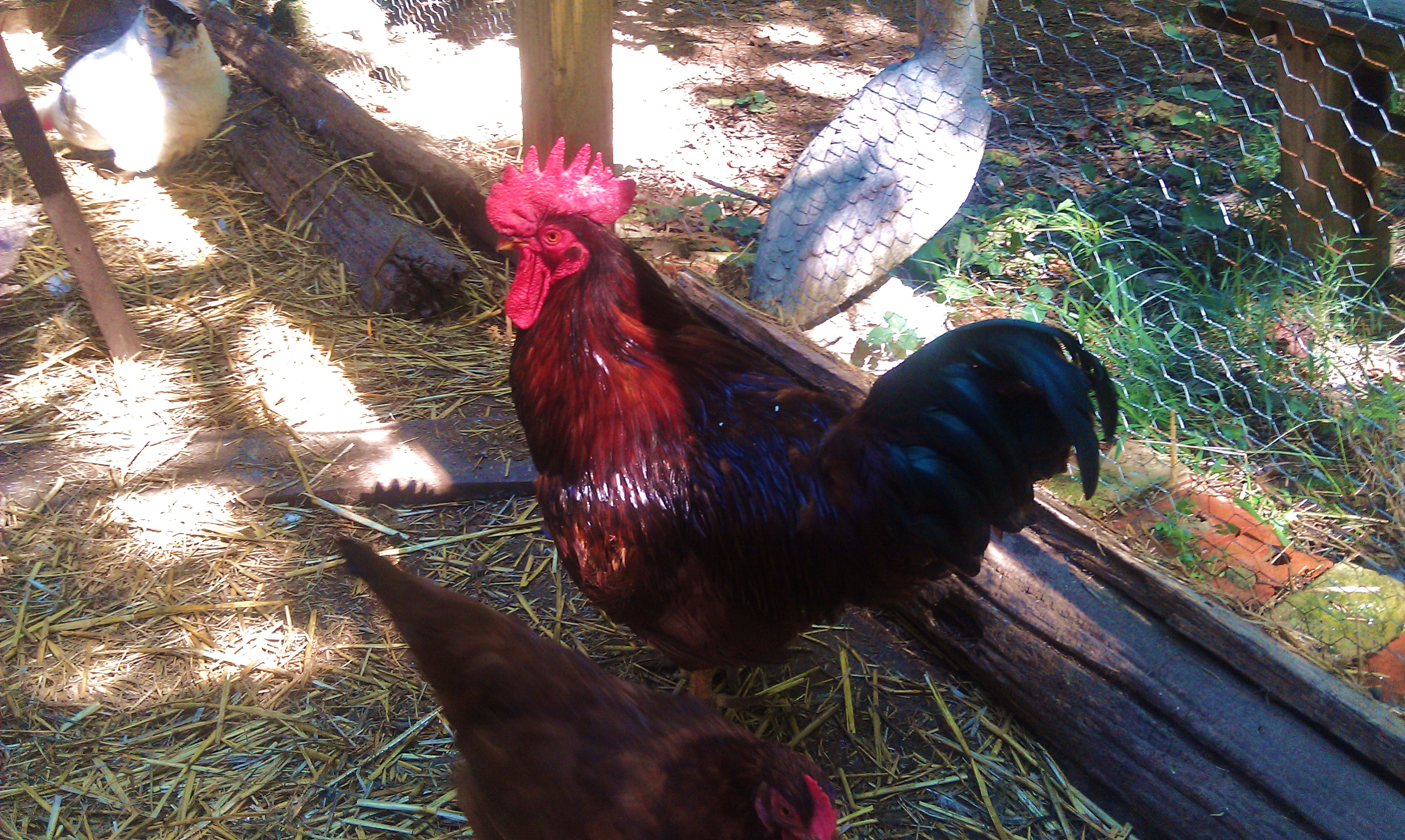 It was a beautiful morning; The sun was shining, but we were cool under the shade of the mature trees. The chickens were clucking quietly, except for RFH (Rooster from Hell) who felt the need to CockleDoodleDo whenever the hens weren’t preening for him.