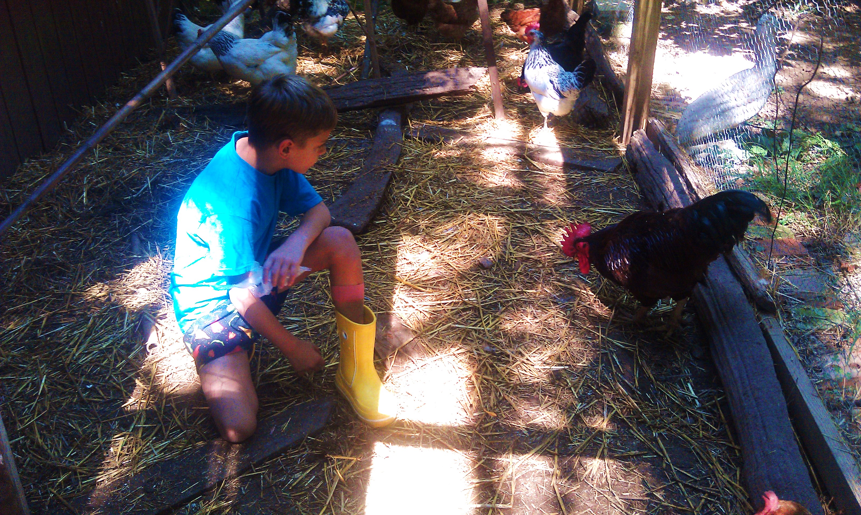 We sat watching the Chickens, my munchkins and I, as they gobbled up the scraps we fed them this morning. Tomorrow is our last day as Chicken-sitters, and we are actually pretty sad about it.