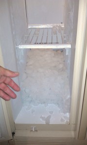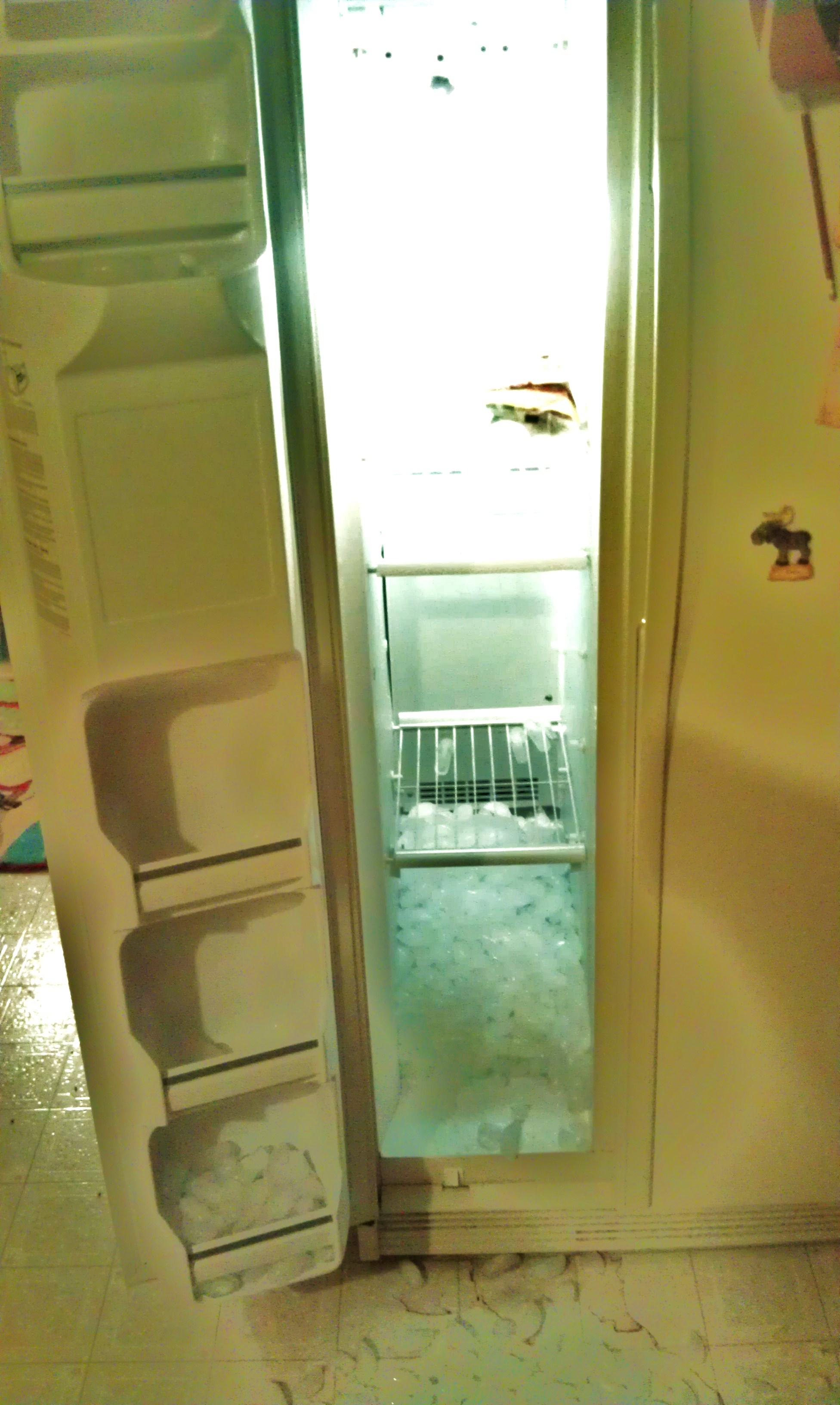 What is that, you say?  Why it’s ice cubes about knee-high in the bottom of the freezer, in the freezer door, and all over my kitchen floor, thank you very much.