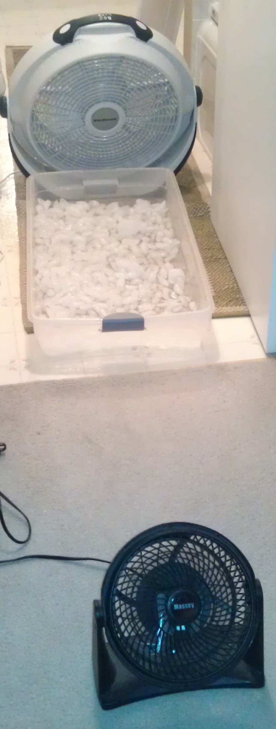 So My Captain gathers up all the wasted ice cubes, puts them in an under the bed storage box we happened to have laying around (doesn’t everyone?), and A LA Wyle E. Coyote, jerry-rigged the following home-made air-conditioner: