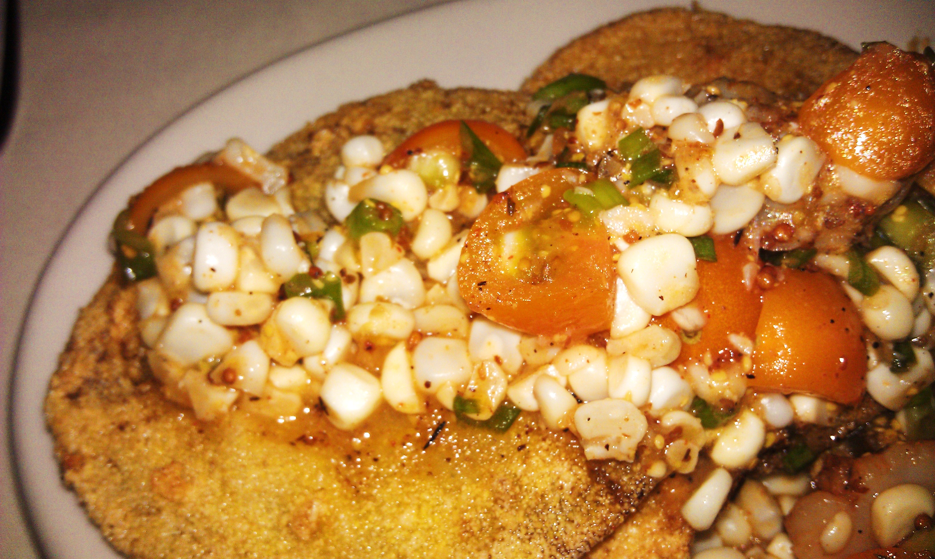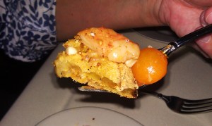 …and there was no going back.  This picture doesn’t do the color justice.  The cherry tomatos were the brightest, happiest orange color I’d ever seen. The shrimp were so tender and flavorful.  The tomatoes were perfectly fried and crunchy.  And the salad dressing on the corn and tomato salad was tangy and salty and sweet all at the same time.