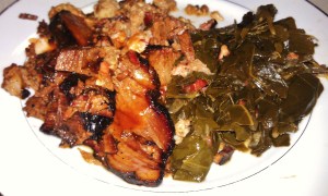 Mmmm.  Juicy.  Tender.  Gone in a plaque-encrusted-artery minute.  He chowed down.  Oh, and don’t forget the Southern Greens….smothered in a vinegary dressing…and yes, those are enormous chunks of bacon you see in amongst those Vitamin laden greens!  Wonderful!