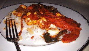 I, on the other hand, went healthy.  (ahem. cough.)  I ordered the Crispy Tofu Country Captain.  It was so dang delicious, you’d never suspect it was healthy.  Fried tofu chunks, crazy flavorful veggies, and served over toasted almond rice…watching me eat it, you’d have thought I was from California and my true name was Bunny.