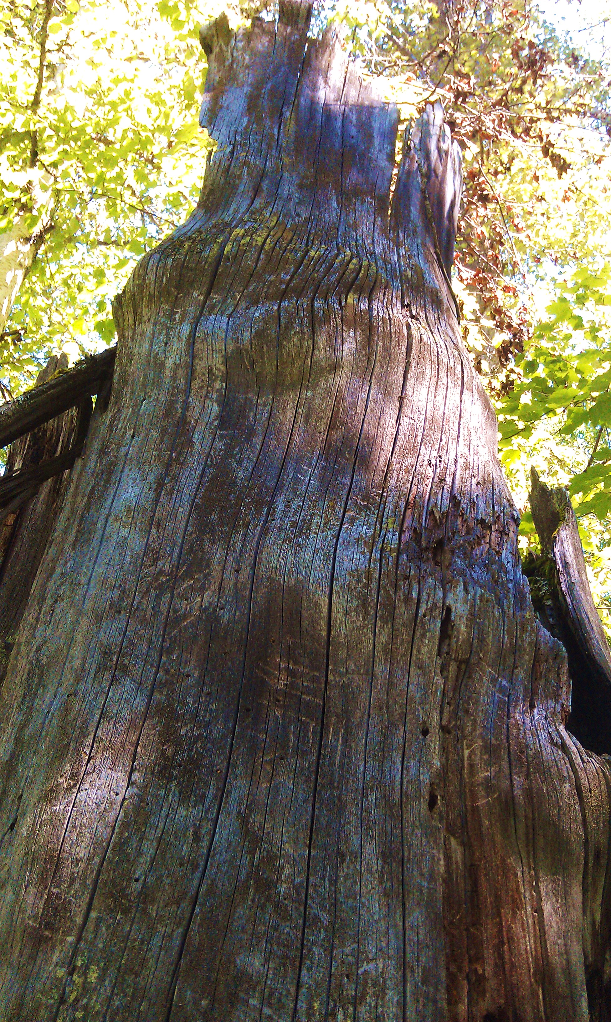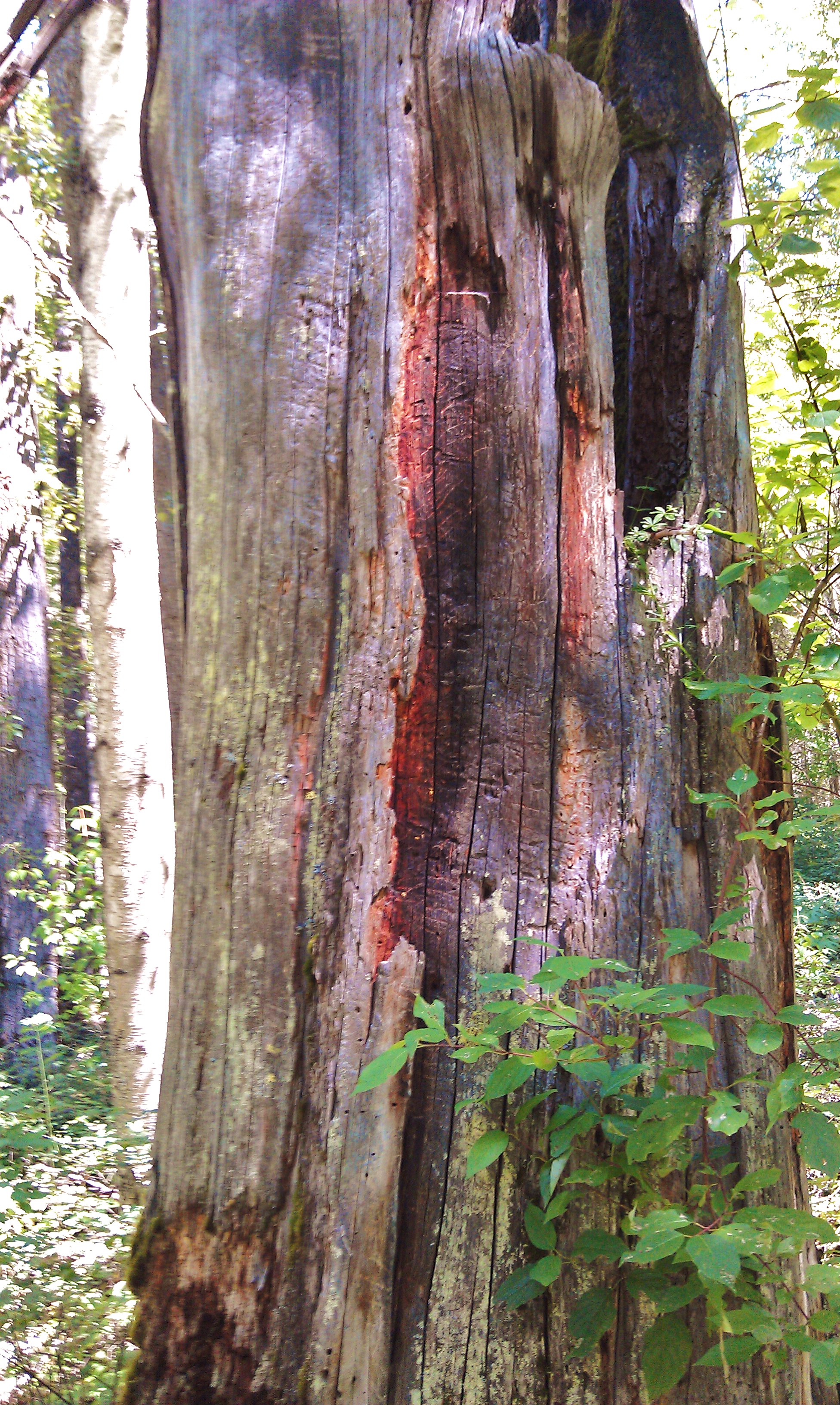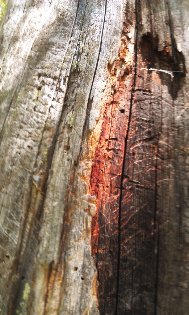 My Captain took Critter for a walk around the perimeter of the property and they came upon a tree that had been well and truly used as a scratching post from a Grizzly Bear.