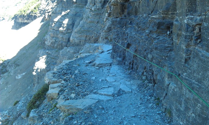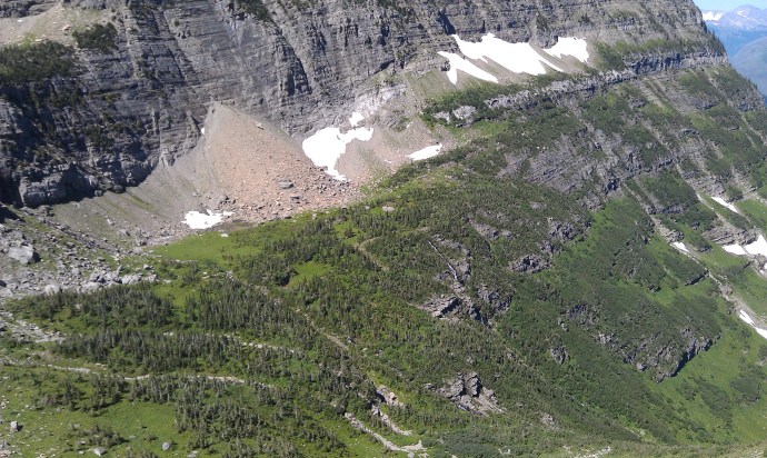 Do you see that road down there? In the upper corner of this picture of Critter on the trail? That road, The Going To The Sun Road, is a full 400 feet down from the rock wall/cliff we were walking on. The cars, the people, all of them were like tiny little ants to us.