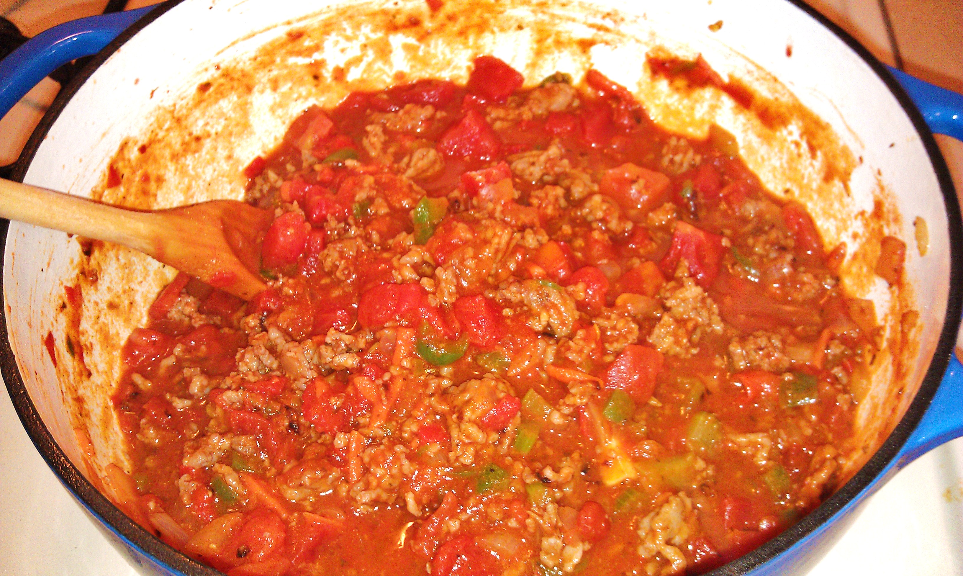 Fresh, and I do mean FRESH onions, peppers, carrots, celery, garlic, italian sausage, Not-fresh-but-at-least-it’s-organic canned tomatos, and assorted/sundry spices all happy in a big enameled cast iron pot. And then, because I’m sassy, I add my grapes: