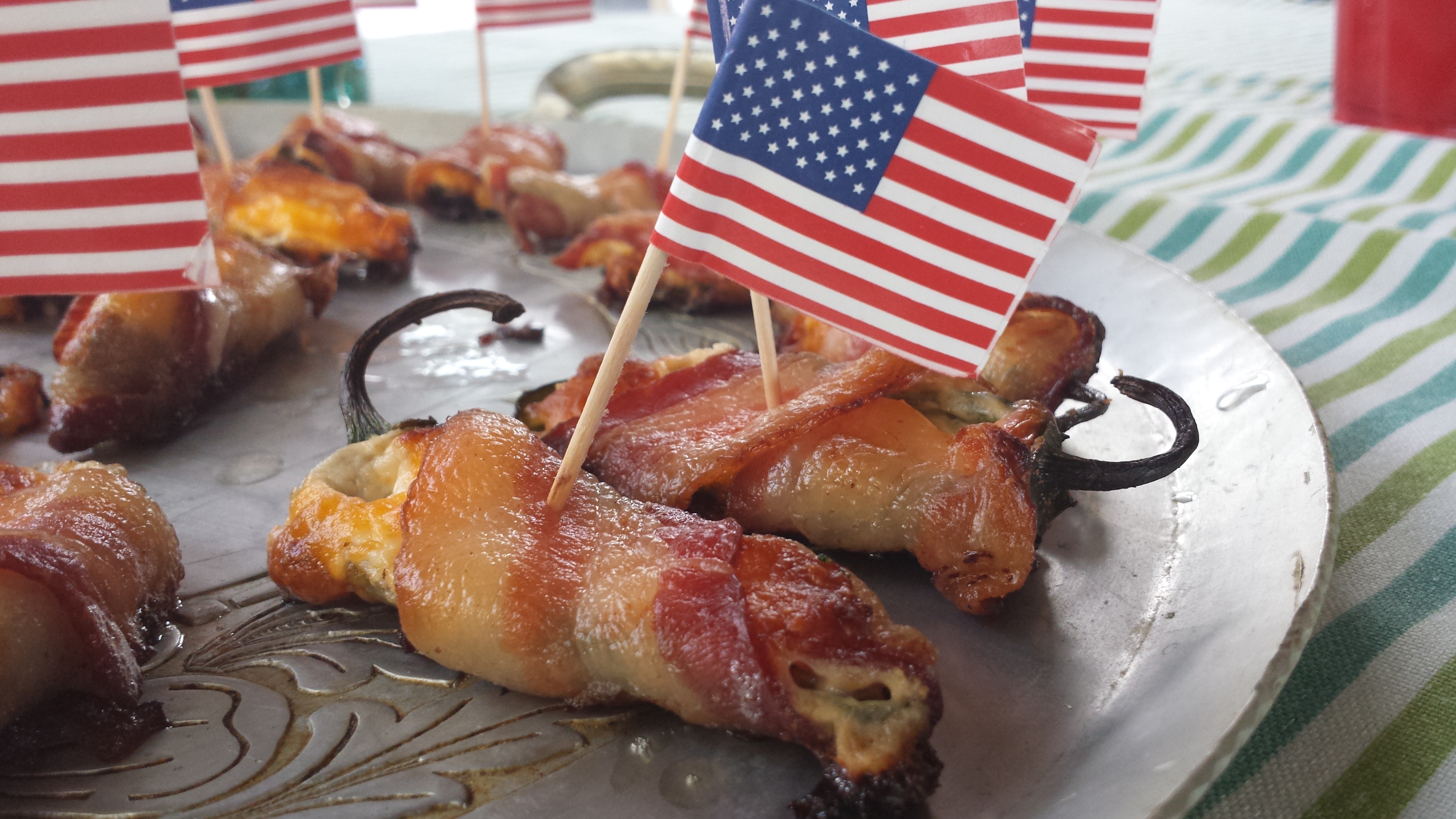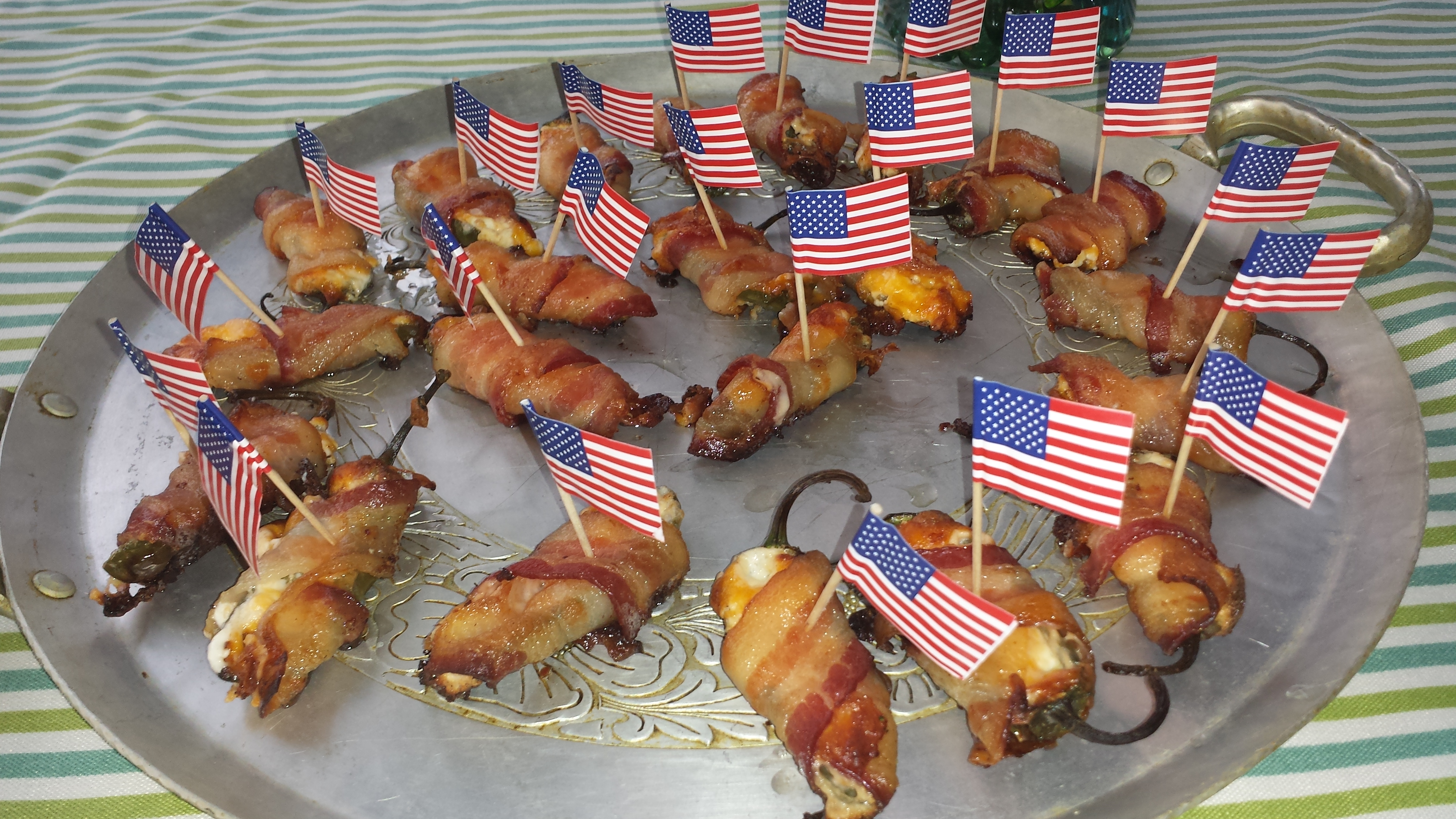Jalapeno peppers stuffed with a mixture of cream cheese and New York sharp cheddar cheese, and wrapped in Bacon. And since it was so close to the 4th of July, I used flag picks instead of run of the mill party picks.