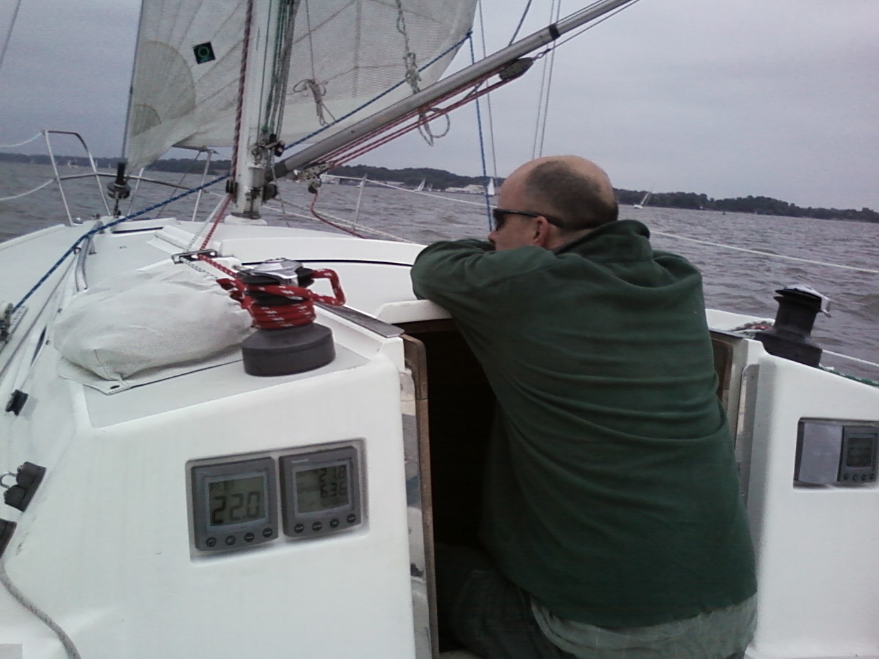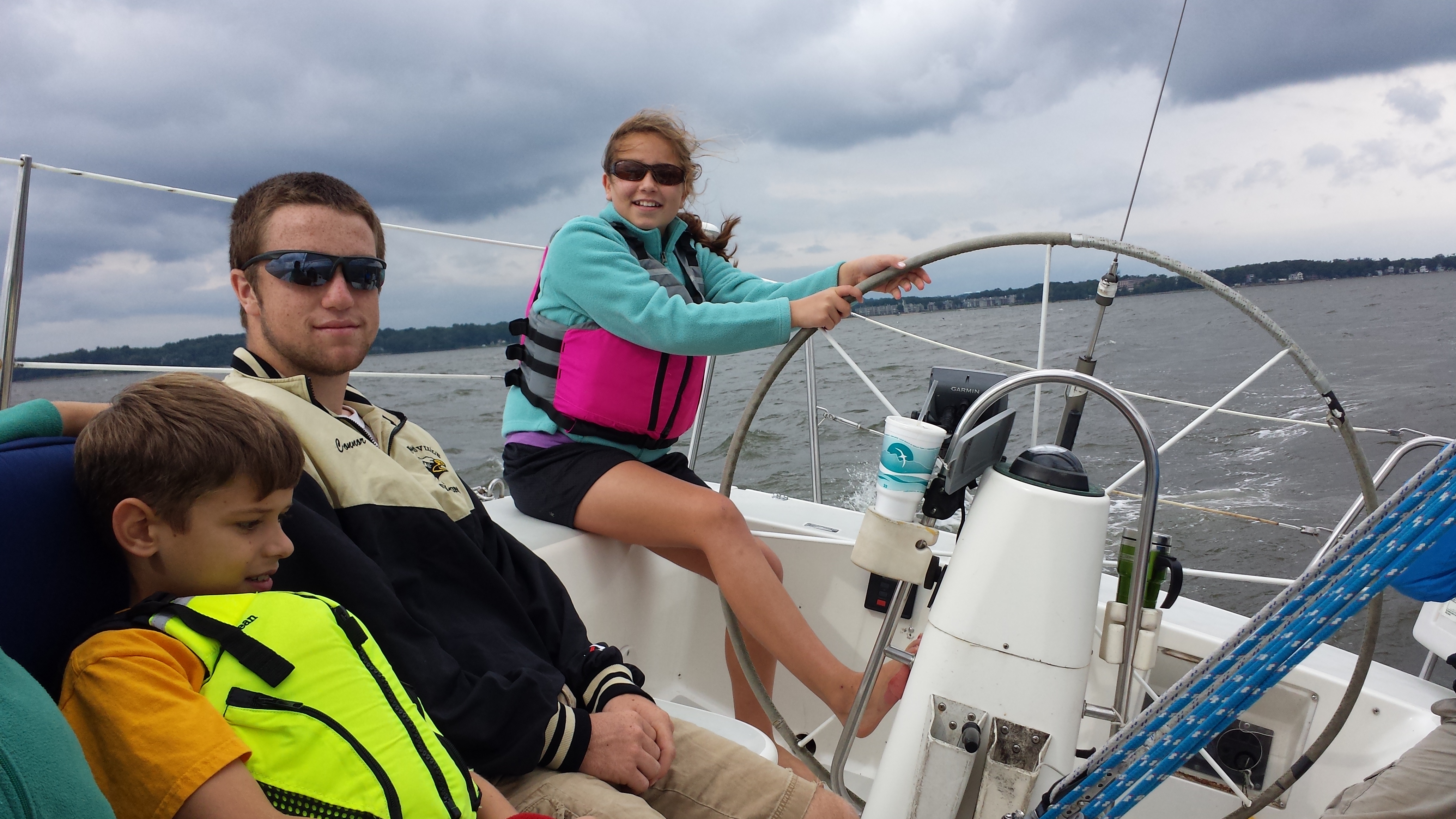 His first time on a sailboat, Connor took to it like a fish to, er, water. He watched Varmint, a veteran student of the Cupcake School of Sailing, at the helm…