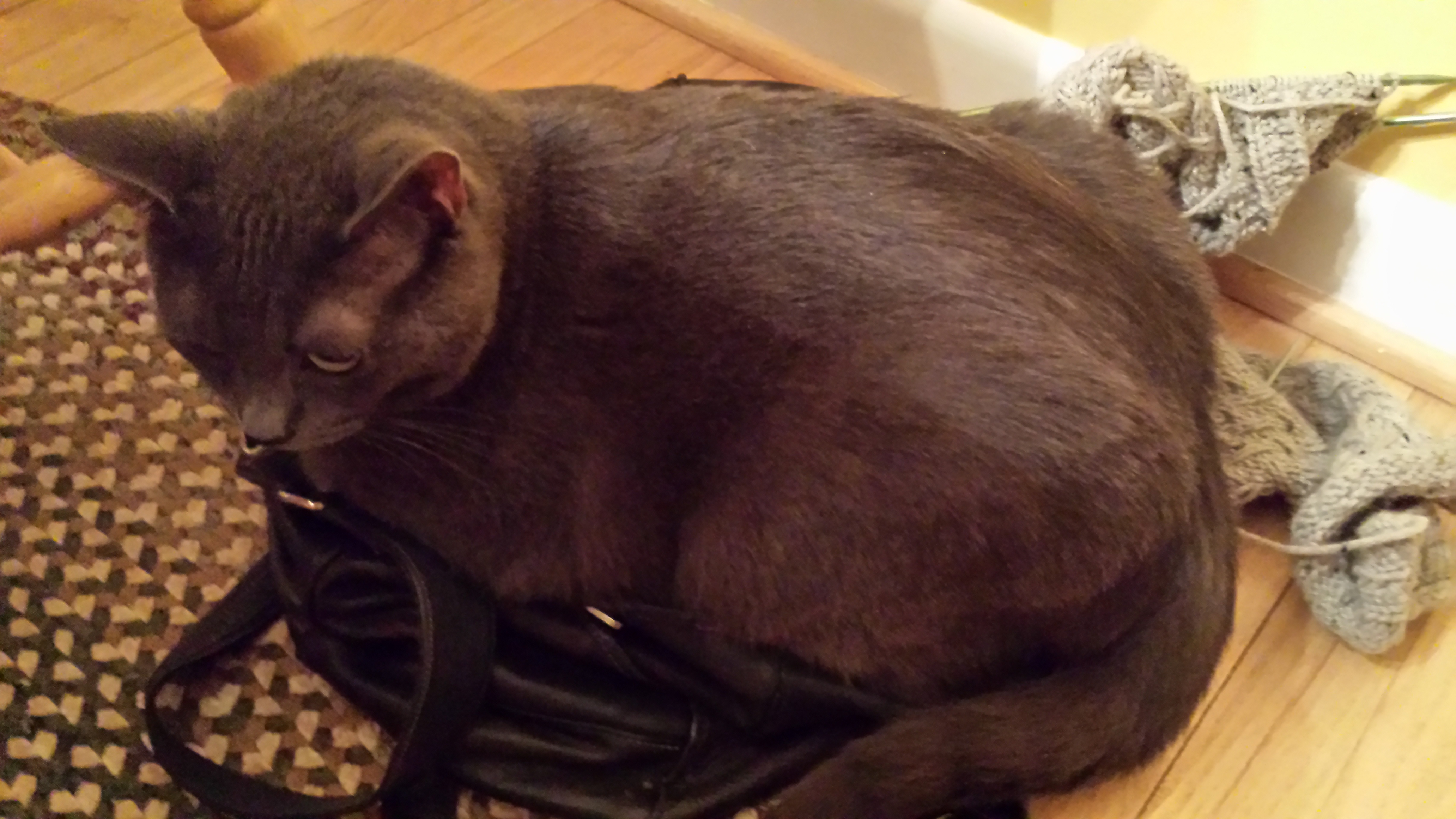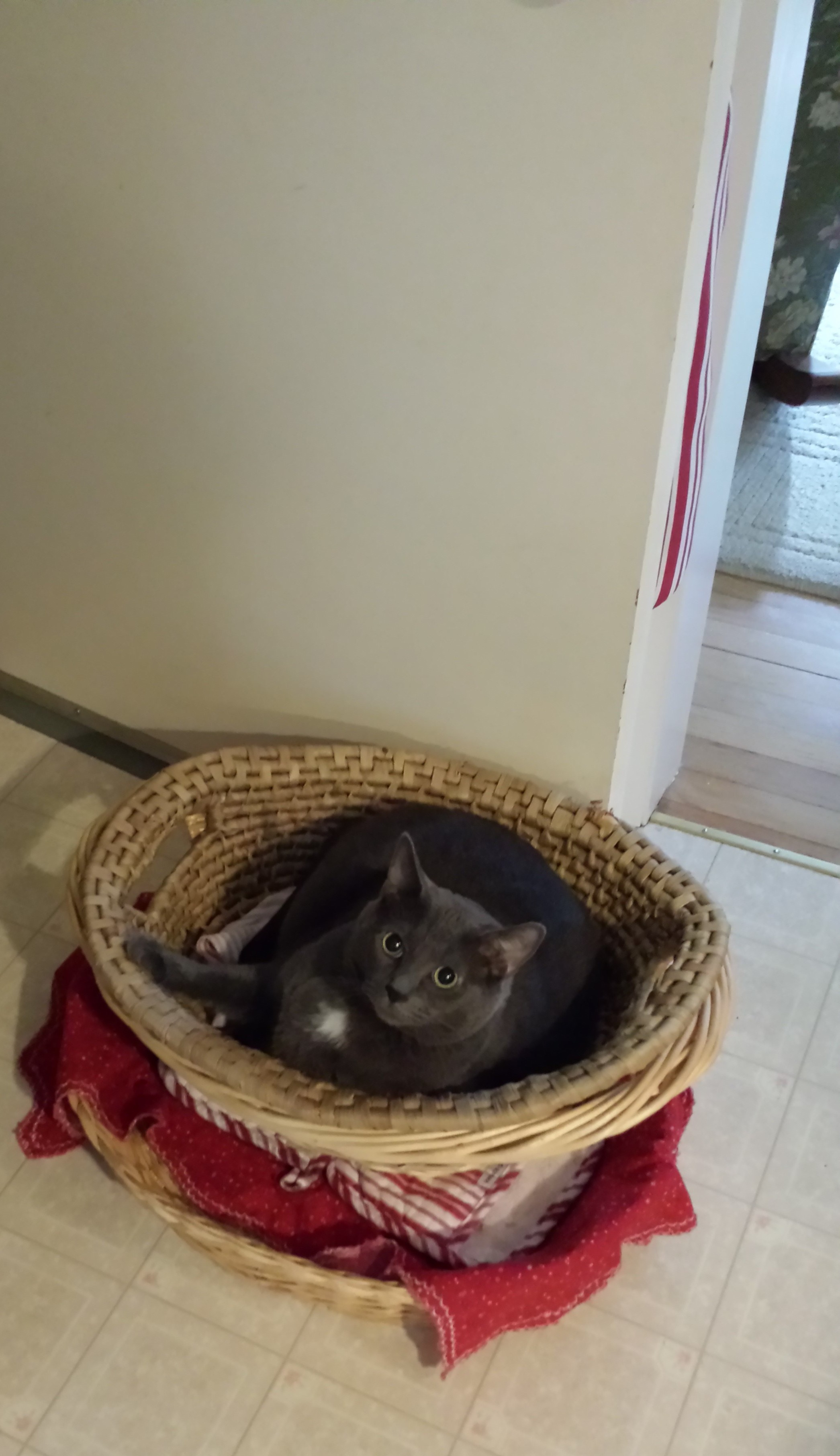 What is WITH this cat? Remember when I told you about Moose, and his fetish with Grandma Jane’s black leather satchel? Well yesterday I found him in a basket I’d put by the basement stairs, and