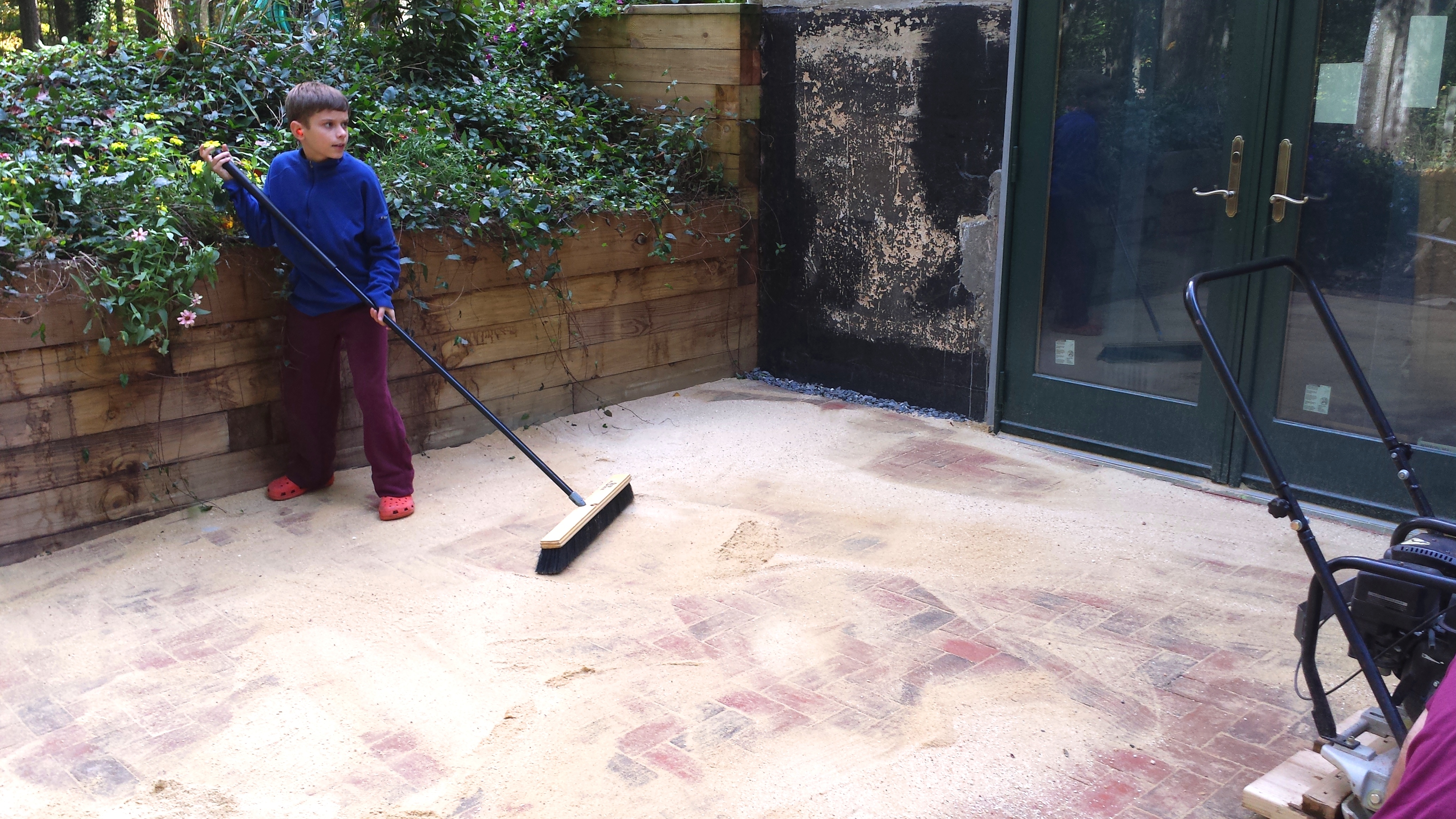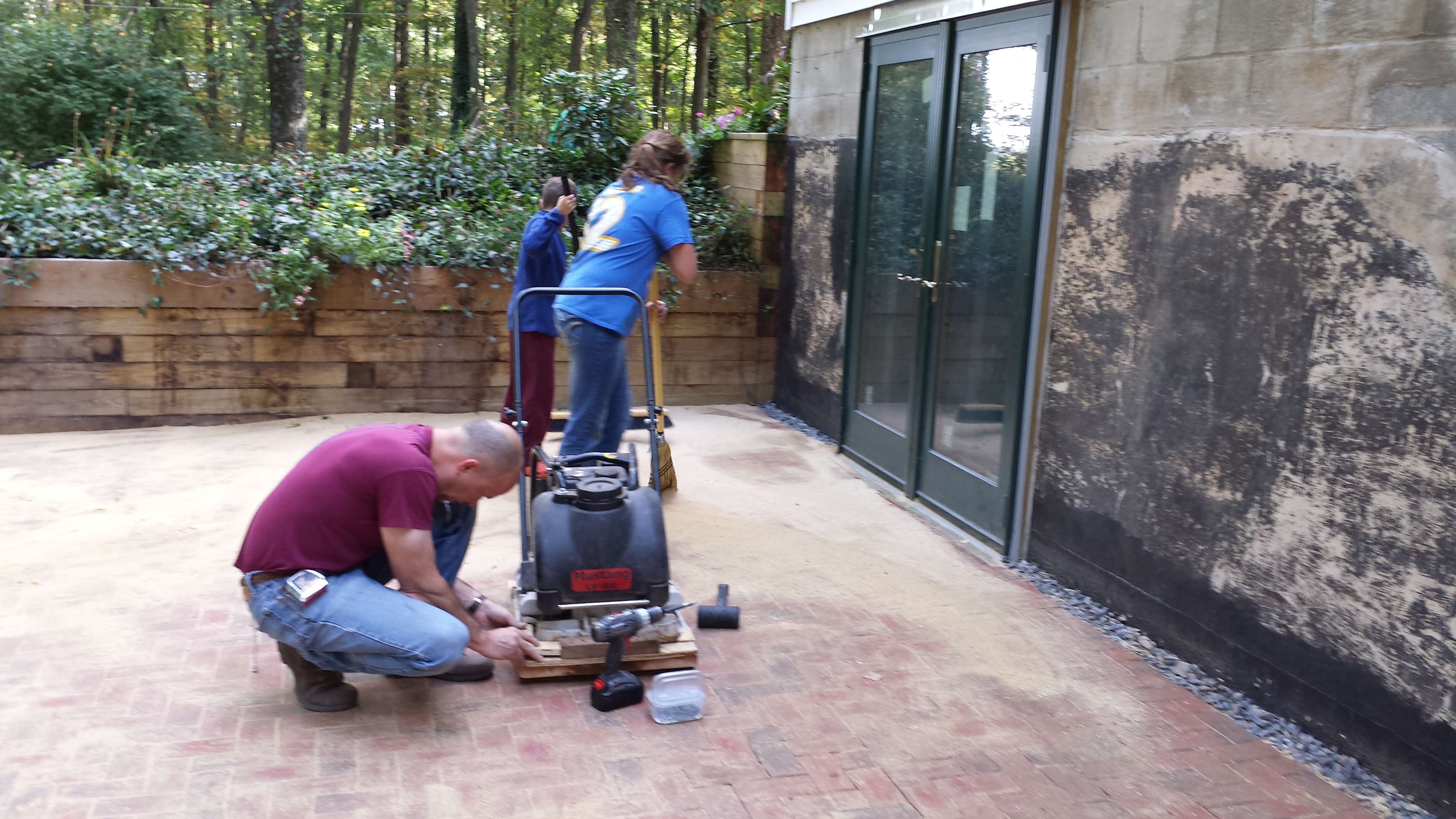You have to take dry concrete sand, and push it back and forth over the cracks and seams of the brickwork. Then you have to tamp it with the gasoline powered tamper.