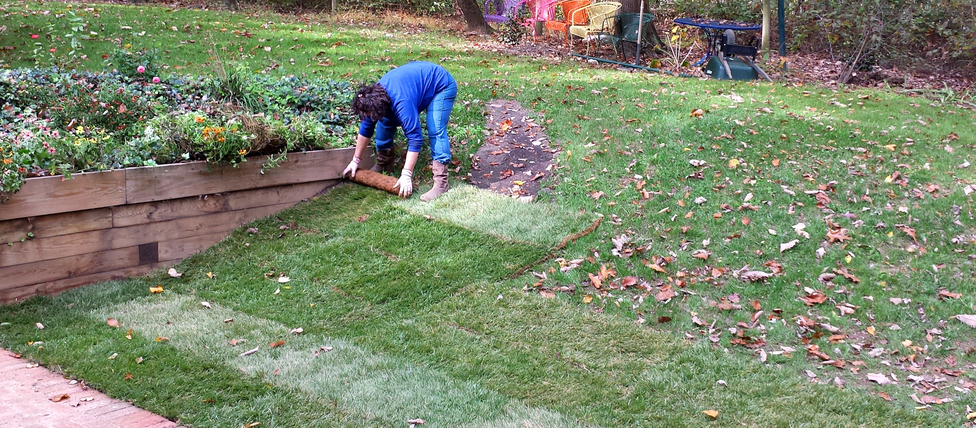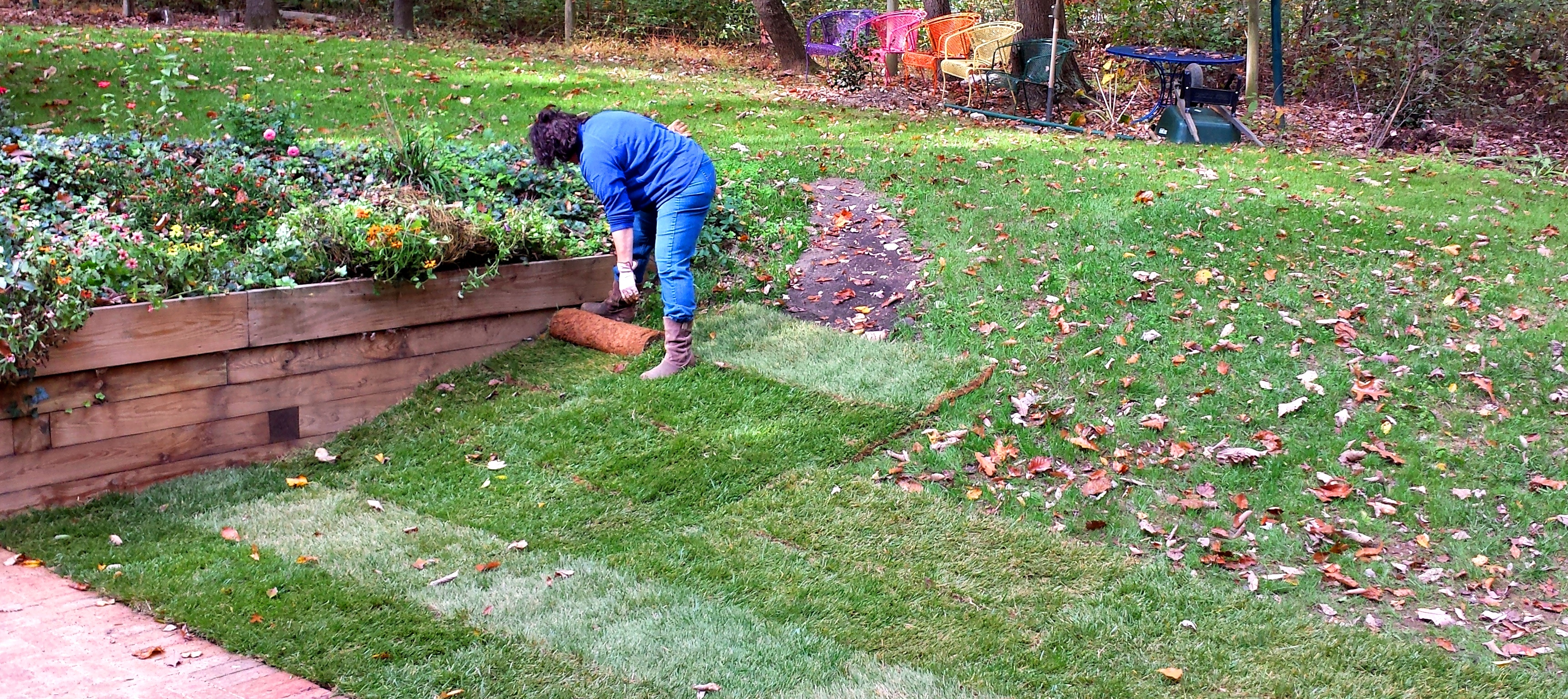 But our rolls of sod had to be laid TODAY. I looked to my left, I looked to my right, and realized, the ‘layer-of-the-day’ would be…drum roll, please….ME. So with a big breath, and an “I think I can!” attitude, I began to unload the sod from the truck bed, and lay those puppies.