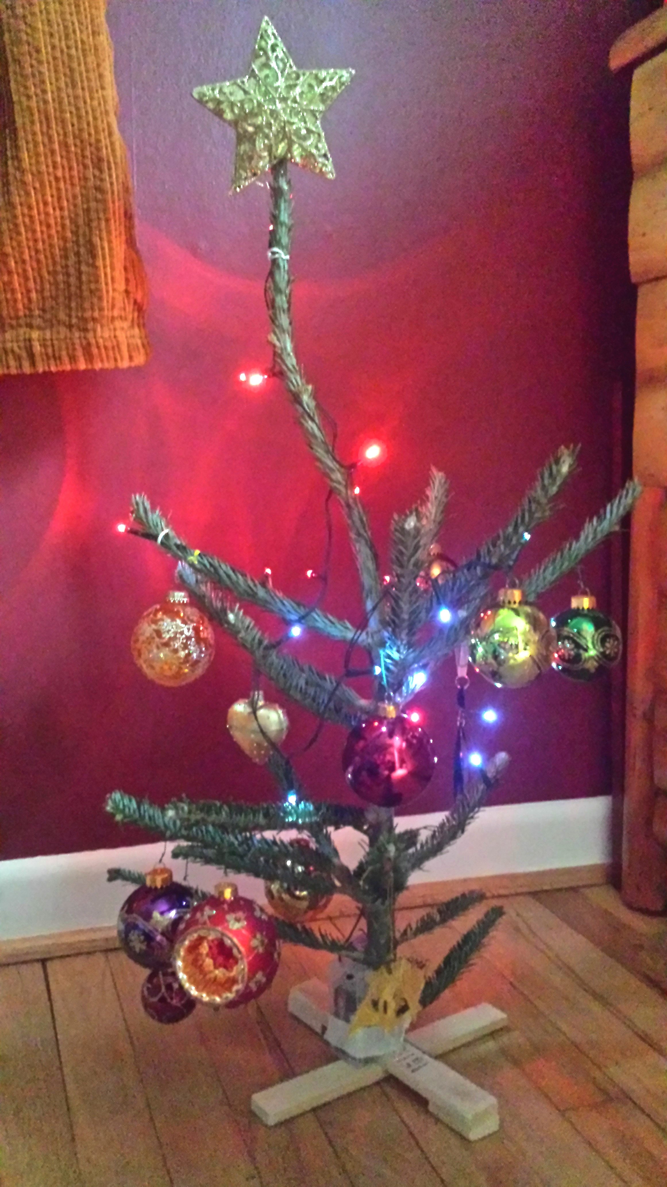 pruned it, put it up, realized it was crooked, and put it up again, decorated it, and decided it was facing the wrong way, so we moved the whole ding-dang show until My Captain’s OCD was satiated.