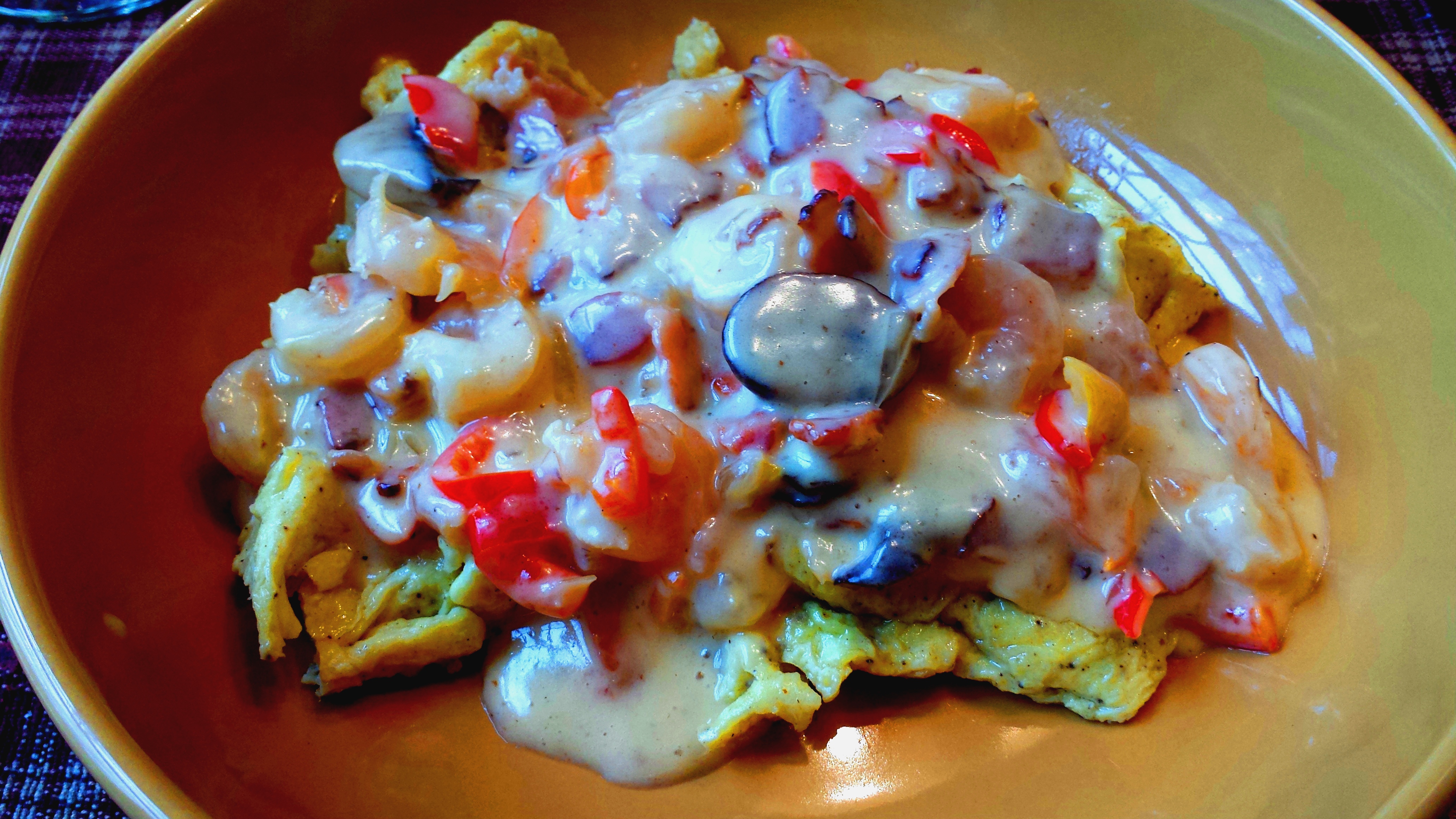 To serve this hot mess, put your cooked scrambled eggs into a different warmed serving bowl (you had one in the oven, right?) and let everyone at the table slop their own serving of eggs onto their plates, followed up with the creamy, wondrous, bacon, shrimp goo.