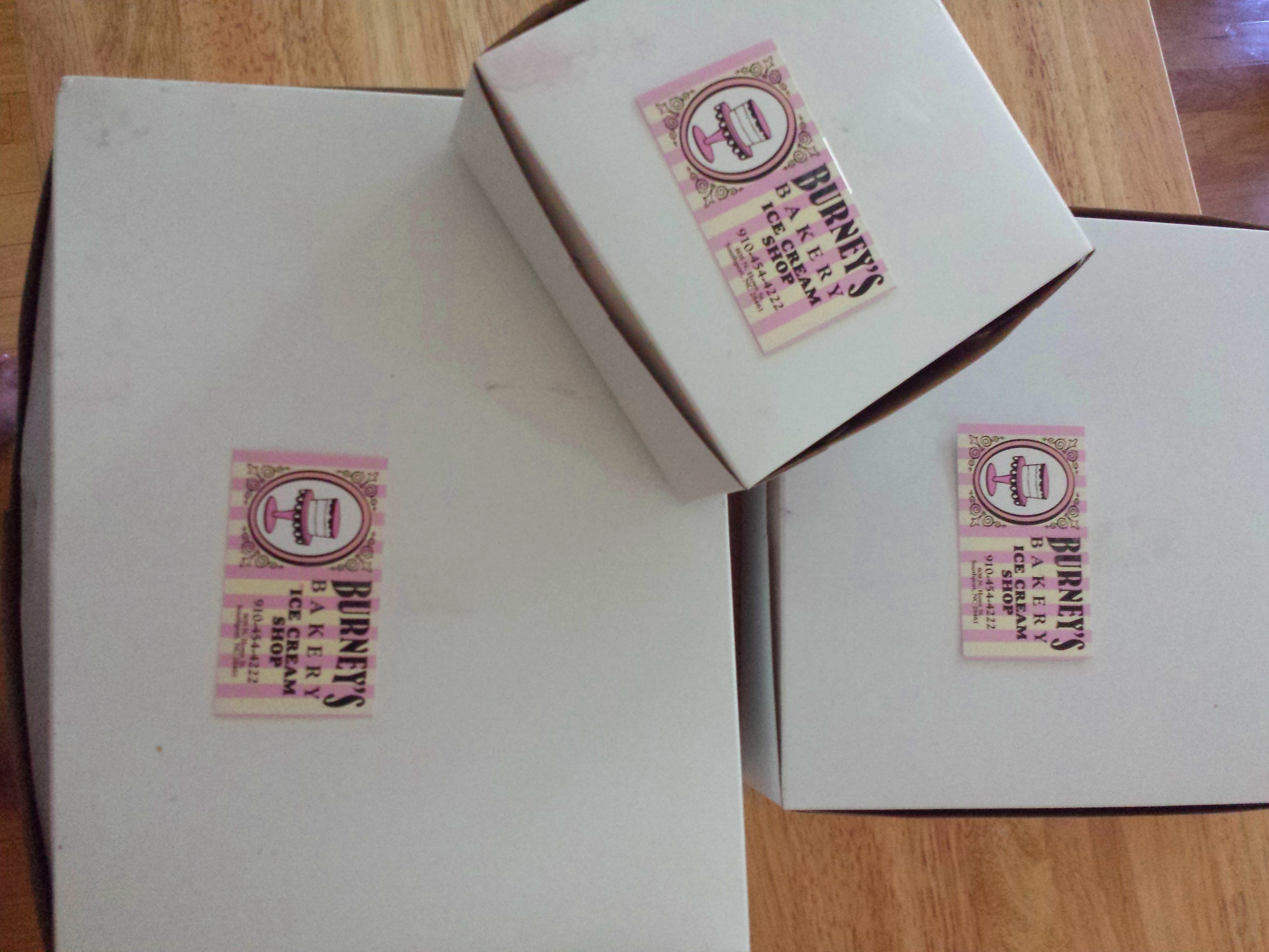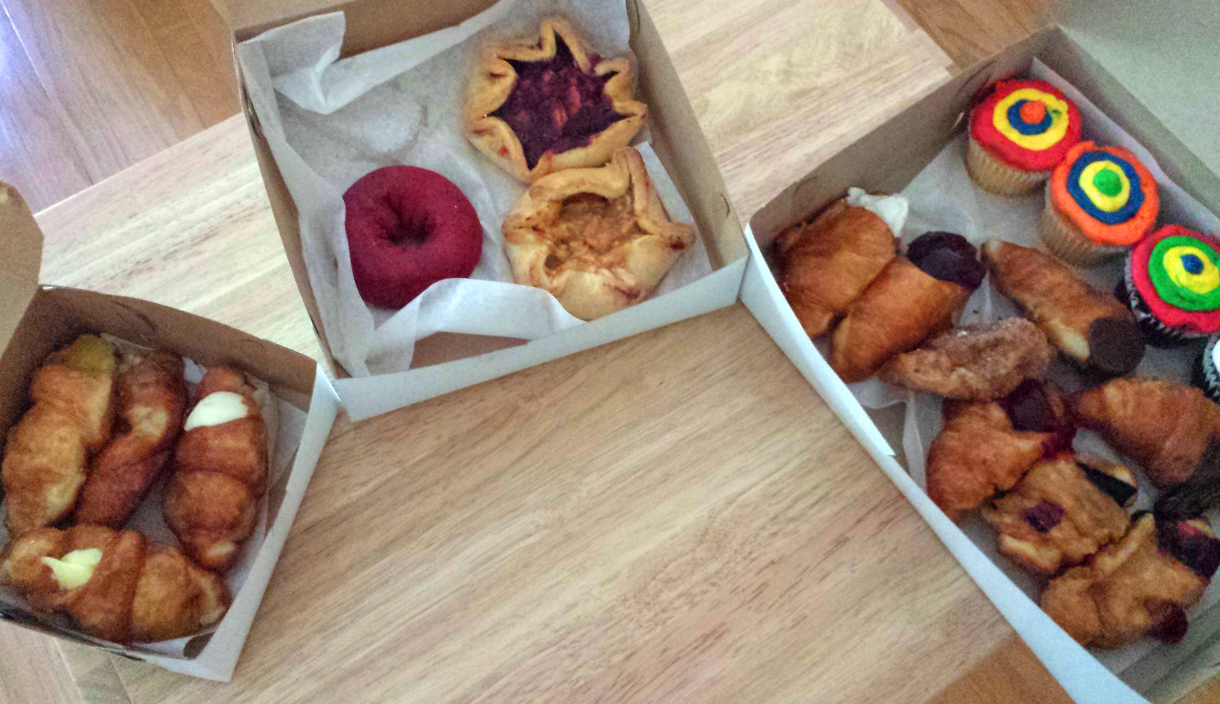 We thanked the lovely bakers profusely, and left with our three big boxes of artery-busting, renal system crushing, pants-seam punishing gifts of edible love.