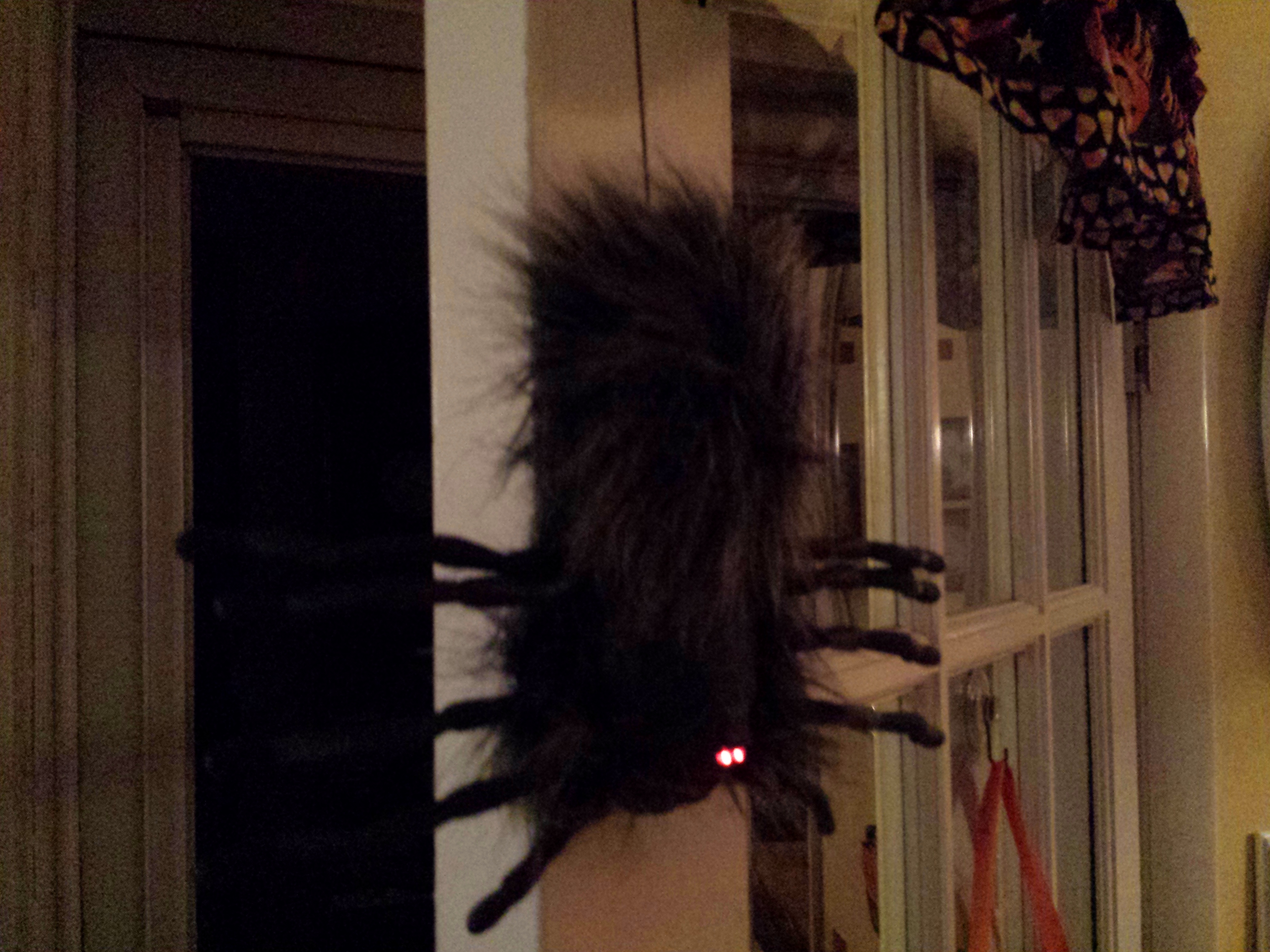 ….complete with blinking red eyes that scares the bejeebies out of me every time it jumps, even though I am the one who hung it in the first place….