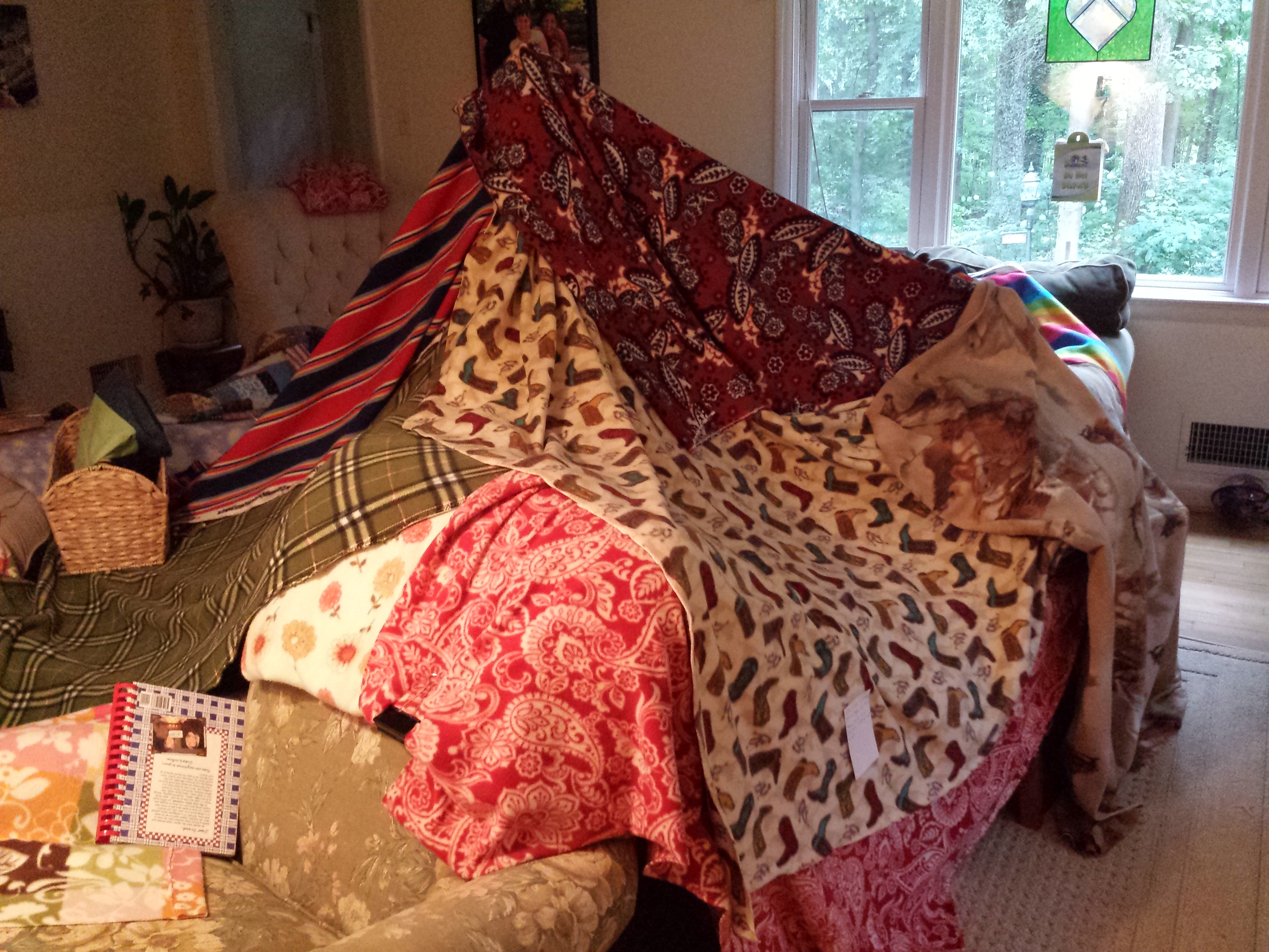 THIS is Critter’s living room fort.  It spans the entire room, and uses all of the chairs, including My Captain’s favorite recliner.  To get into the fort, you have to say the password.