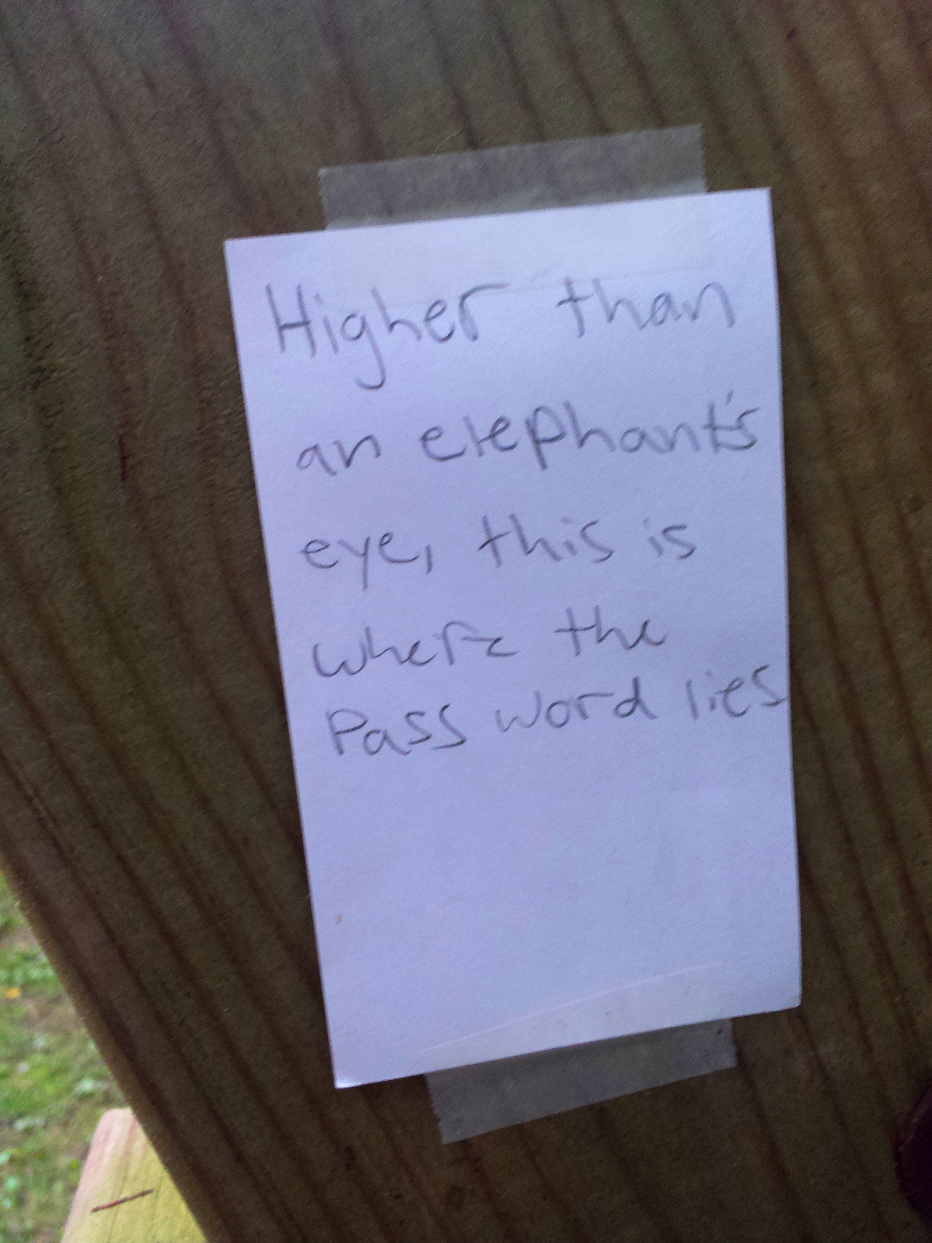 We followed the smashed hosta leaves to Cookie’s grave marker, and found the next clue. Note to self: Remind Critter that henceforth we will NOT be placing clues in any of mommy’s flower beds.